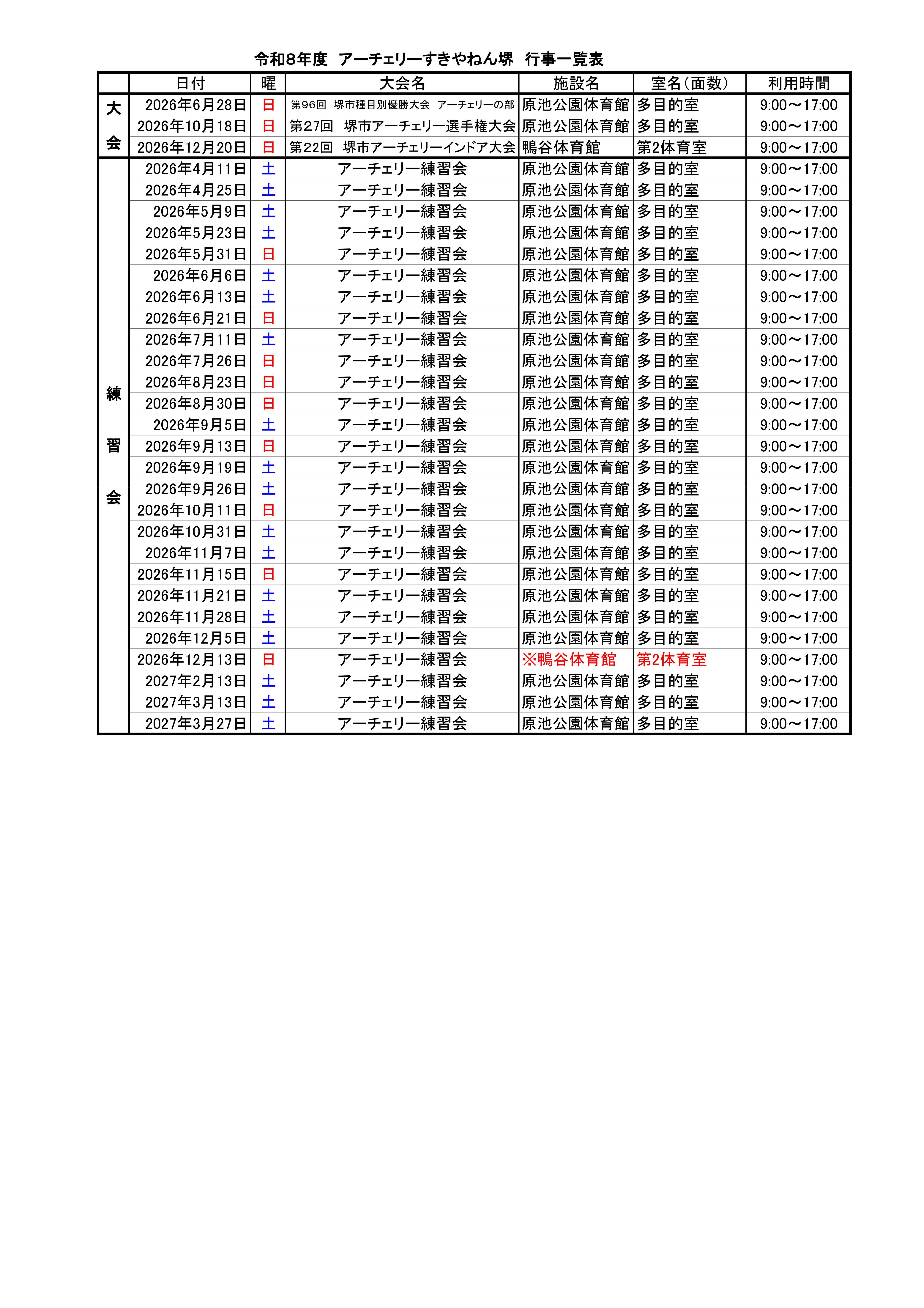 令和8年度の練習会開催予定を掲載しました